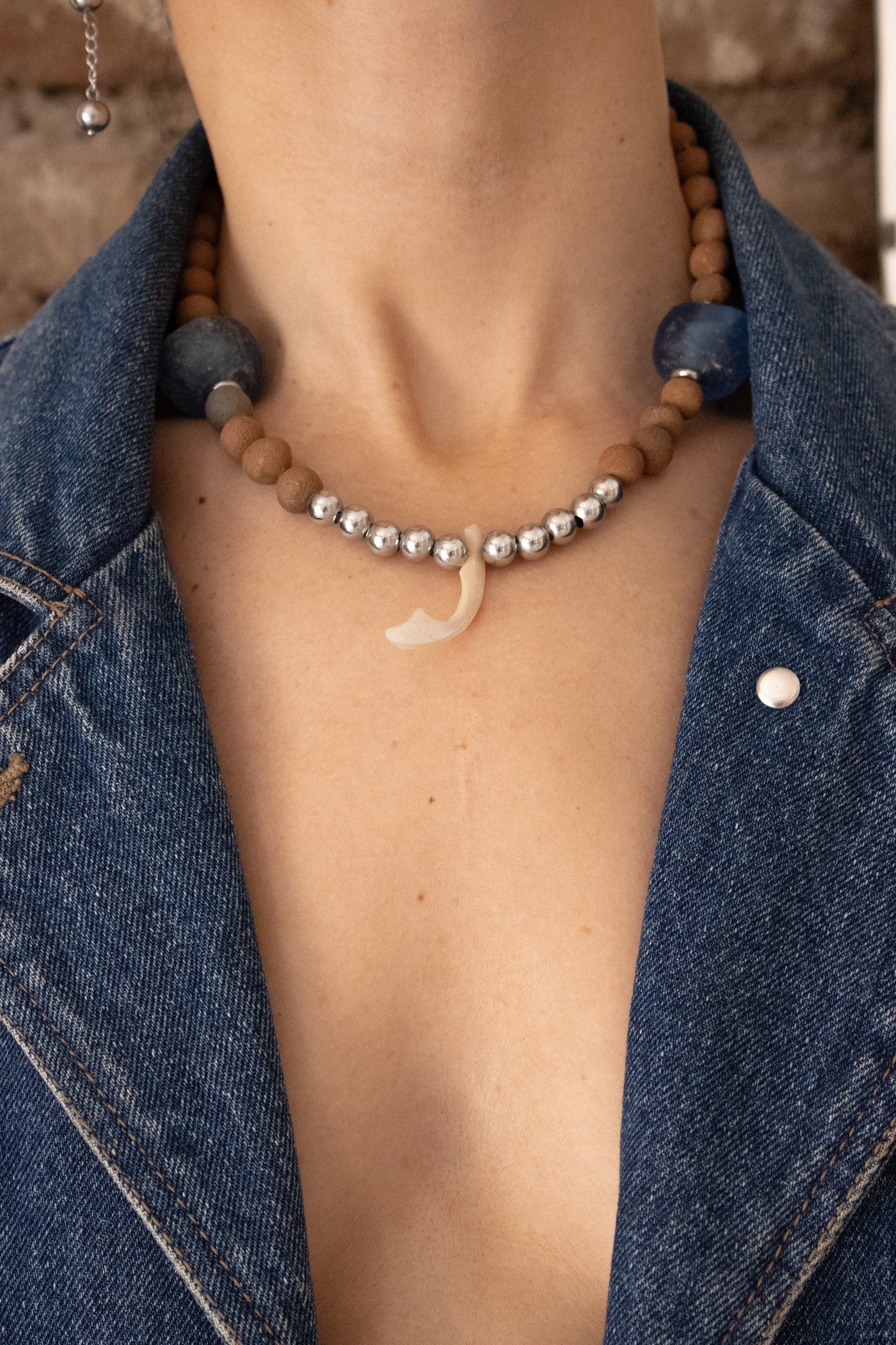 Stainless steel, vintage African sea glass, clay beads by Pai Pai indigenous community from Baja California and mother of pearl.